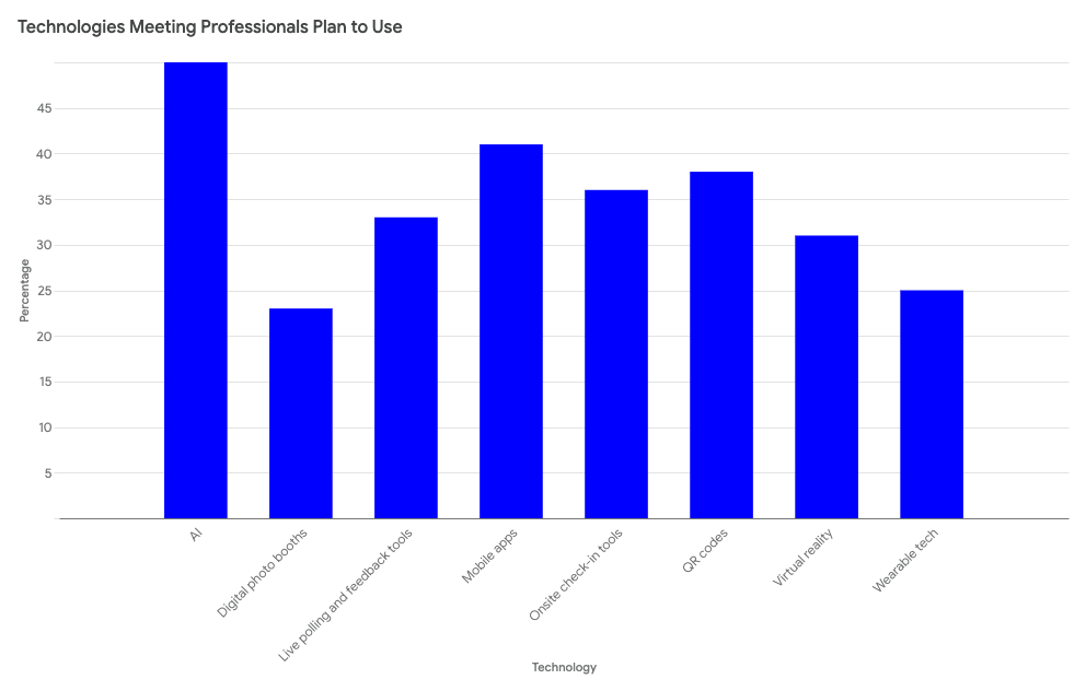 The survey also eveals that meeting professionals are eager to embrace new technologies in the coming years. Leading the pack is artificial intelligence (AI), with 50% of planners aiming to integrate it into their strategies. This aligns with a broader trend of leveraging AI for a variety of tasks, including: